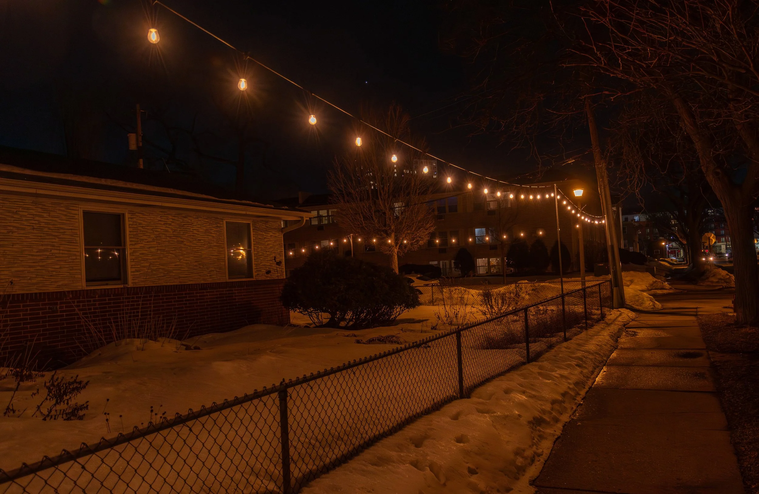 We strongly encourage the use of string lighting, which is affordable, energy-efficient, and well-suited for pedestrian areas. String lights provide even, shadow-free illumination without harsh glare or excessive light spill. For example, a 48-foot string of lights uses just 24 watts of electricity while providing sufficient light for the sidewalk along a typical urban lot.